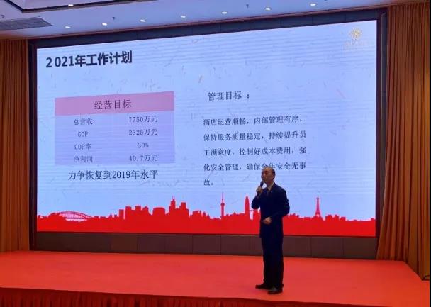 在對2020年度工作全面總結(jié)中,酒店經(jīng)營班子肯定了全體員工在過去一年的辛勤付出和取得的經(jīng)營成效,并對2021年度工作目標(biāo)進(jìn)行了部署和動員。