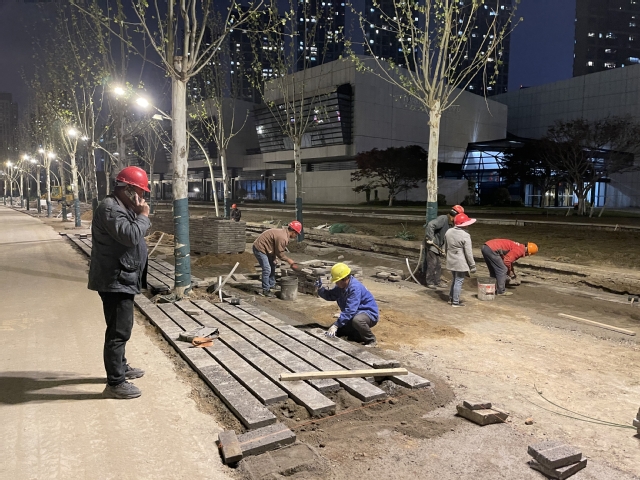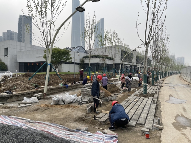 接到4月21日前完成(和園-南京濱江規(guī)劃建設(shè)展示中心段)景觀恢復(fù)的節(jié)點(diǎn)任務(wù)之后,市政公司立即調(diào)整施工計(jì)劃,增加物力支持,加大投入機(jī)械設(shè)備進(jìn)場(chǎng)量,確保高質(zhì)高效施工,穩(wěn)步推進(jìn)工期進(jìn)度。同時(shí),組織施工隊(duì)伍連夜施工,逐一確定施工材料供貨節(jié)點(diǎn)。施工結(jié)束后當(dāng)天及時(shí)復(fù)盤,并按進(jìn)度調(diào)整次日工作計(jì)劃。
