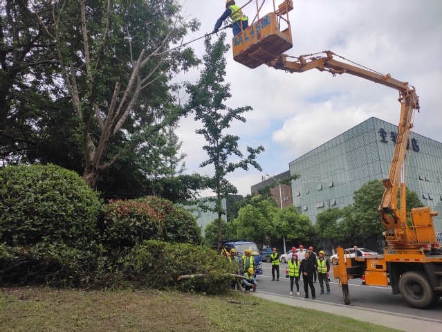 與此同時(shí),另一條指令隨即傳出,“河西大街樹木枯枝斷枝,存在極大安全隱患,立刻到場處置”。公司立即調(diào)配3輛園林搶險(xiǎn)車輛、1輛高架車,20名搶險(xiǎn)隊(duì)員第一時(shí)間趕到現(xiàn)場。指揮勘查險(xiǎn)情、實(shí)施圍擋、引導(dǎo)交通、處理險(xiǎn)枝,大家分工明確、操作熟練,搶險(xiǎn)過程一氣呵成。20分鐘后,這株干徑超過40厘米、高10米的大樹上的枯枝已全部修剪到位,解除了安全隱患。