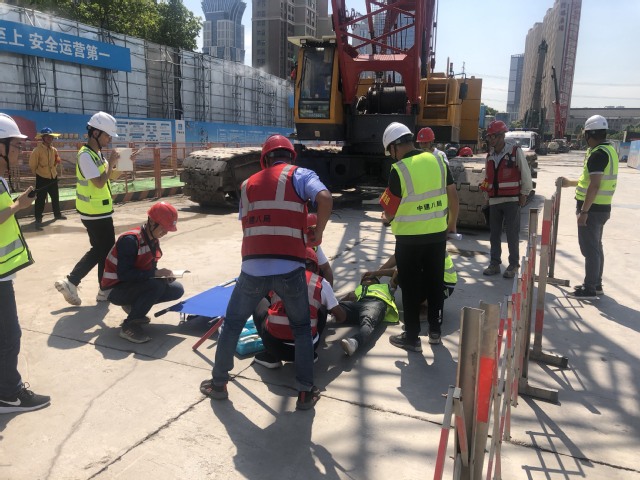 本次應(yīng)急演練活動模擬施工現(xiàn)場履帶式起重機(jī)在作業(yè)過程中由于鋼絲繩斷裂,吊物從高處掉落倒下,不幸將地面一名作業(yè)人員腳部砸傷的事故?,F(xiàn)場專職安全員發(fā)現(xiàn)后第一時間向應(yīng)急救援指揮部匯報,應(yīng)急救援指揮部立即啟動應(yīng)急預(yù)案,各應(yīng)急救援小組接到救援命令后,迅速跑向事故地點,對受傷人員開展救援工作,同時拉起警戒線,保護(hù)現(xiàn)場。救援人員按預(yù)案分工,有條不紊地實施清障、包扎、傷員擔(dān)架固定、運送上救護(hù)車等一系列動作。本次演練活動,增強了員工的安全操作意識,提高了快速反應(yīng)能力、應(yīng)急救援能力以及協(xié)同作戰(zhàn)能力。