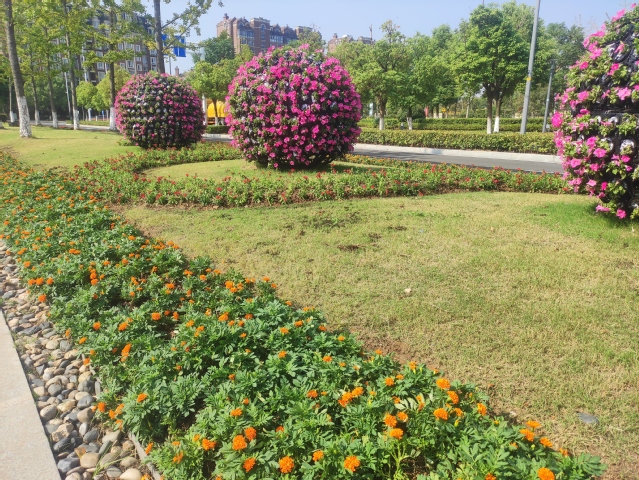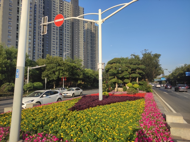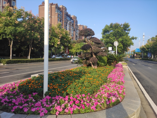 水韻路中分帶的花球也換上了新裝,10個(gè)巨大的牽?;ㄇ虮患t黃色的花帶簇?fù)碇?,在太陽下盡情地綻放著,像是小孩的笑臉,歡快地為祖國母親慶生。