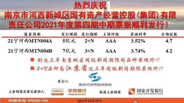 11月1日,集團2021年度第四期永續(xù)中票順利發(fā)行,發(fā)行金額12億元,期限3+N年品種7億元,票面利率3.74%;期限2+N年品種5億元,票面利率3.52%,均取得南京市近三年同級別同品種最低價格!