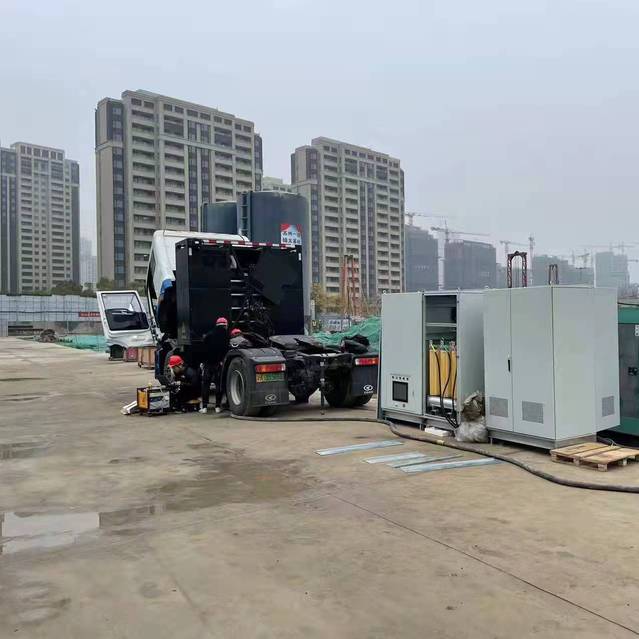 受接入的施工用電線路功率限制,現(xiàn)有配電箱無法滿足新增打樁設(shè)備用電需求。按常規(guī)做法需增設(shè)柴油發(fā)電機,但此類型發(fā)電機噪音大,排放高溫廢氣,不符合現(xiàn)代社會節(jié)能環(huán)保的大趨勢。因此,本項目率先引進無噪音、無廢氣排放的鋰電移動儲能動力站與施工用電線路并網(wǎng),在施工用電低谷期間進行電池充電,樁基施工用電高峰期間補充電力缺口。如接入的施工用電線路長期滿載,可由儲能動力站廠家運送滿電電池進行現(xiàn)場換電,將缺電電池運回充電。