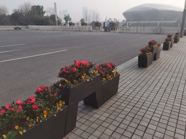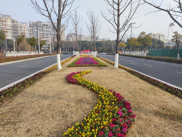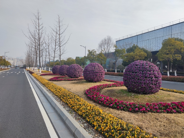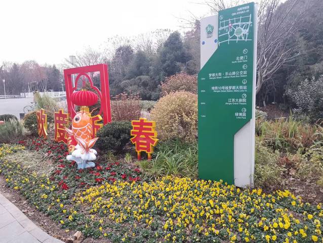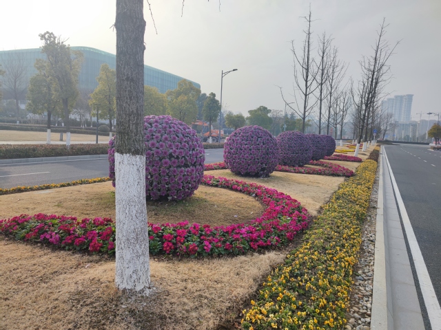 南京奧體中心北門(mén)夢(mèng)都大街人行道旁新增設(shè)一組 “歡度新春”花境式小品生態(tài)微景觀,深紫色羽衣甘藍(lán)與黃色三色堇植物的搭配,簡(jiǎn)潔明了,“鯉魚(yú)躍龍門(mén)”小品和“歡度新春”字樣的組合營(yíng)造出濃濃的年味。道路中分帶的花球換上了“新裝”,4個(gè)巨大的羽衣甘藍(lán)花球在太陽(yáng)下盡情地綻放著,烘托出了冬奧會(huì)的隆重氣氛,寓意在歡度新春佳節(jié)之際,祝愿冬奧會(huì)的奧運(yùn)健兒們能夠魚(yú)躍龍門(mén)創(chuàng)佳績(jī)。