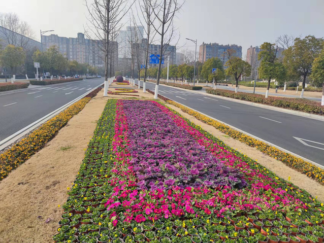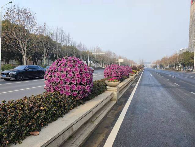 江蘇大劇院水韻路中分帶的花球也換上了“新裝”。10個(gè)巨大的羽衣甘藍(lán)花球被粉色的報(bào)春花和紅黃顏色角堇組成的花帶簇?fù)碇?/span>與兩邊的直線橙色花邊、方形花卉矩陣、流線型花帶一起構(gòu)成了一幅色彩斑斕、氣勢(shì)恢宏的絢麗畫(huà)卷,不但為兩會(huì)烘托出莊嚴(yán)隆重的氛圍,也洋溢著春節(jié)喜慶的氣氛。