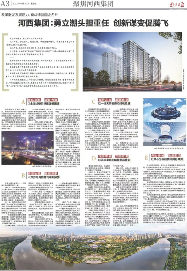 在南京城市建設史上,河西注定是濃墨重彩的一筆。2002年,河西新城區(qū)建設拉開大幕,南京首個以新區(qū)開發(fā)建設為主責主業(yè)的投融資平臺——河西集團應運而生,陸續(xù)建成了南京國際博覽中心、青奧雙塔、濱江風光帶等一批標志性工程,以及學校、醫(yī)院、道路等一批基礎設施。2019年,按照市委市政府的部署,“事企分離”后,河西集團獨立運作。為適應激烈的市場競爭,河西集團以解放思想為先導,以體制轉換為動力,以機制創(chuàng)新為突破,通過思想“破冰”引領行動“破題”?!e極穩(wěn)健規(guī)范解決混編混崗問題,形成內(nèi)設機構及職能調(diào)整方案,在確保各項工作有序銜接的前提下,實現(xiàn)機構設置及人員調(diào)整平穩(wěn)過渡。 ——建立健全“三重一大”決策制度、黨委會議事規(guī)則等管理制度;以戰(zhàn)略管控、組織架構、人力資源等管理流程塑造為重點抓好頂層設計,倒逼管理提升。 ——深入推進“三項制度”改革,開展員工崗位“雙向選擇”,實行全員績效考核。推進任期制和契約化管理,經(jīng)理層成員任期制和契約化管理占比100%。——積極推進數(shù)字化轉型,全力打造“數(shù)字河西”,建立起1個專網(wǎng)、2個體系、3個平臺的信息化體系架構,促進各業(yè)務板塊協(xié)同融合。聚焦高質(zhì)量發(fā)展,對業(yè)務板塊進行深度優(yōu)化,深入推進力量整合,提升市場競爭力?!獖W體公司堅持走專業(yè)化、特色化、精品化道路,以精品工程鑄就品質(zhì)住宅新標桿,攜11個項目重回南京樓市中心舞臺?!M建集中建設管理中心,全力拓展集中建設市場業(yè)務,集中實施建設項目有序推進。——推進新城公司、項目公司整合重組,加快市場化轉型;組建紫金商業(yè)管理公司,統(tǒng)一運營集團商業(yè)資產(chǎn);推進物業(yè)板塊戰(zhàn)略改革,成立江山智聯(lián)(江蘇)物業(yè)服務公司。——推進“公園—園林—市政”板塊融合,板塊內(nèi)各公司發(fā)揮各自優(yōu)勢,合力拓展外部市場。——整合集團金融資產(chǎn),成立基金公司,全面聚焦數(shù)字經(jīng)濟、電子信息、雙碳科技等方向,積極布局工業(yè)互聯(lián)網(wǎng)、智慧城市、清潔能源技術、綠色建筑技術等細分賽道。與此同時,啟動園林公司混合所有制改革;理順集團旗下6家酒店管理體制;商業(yè)板塊首個混合所有制項目招商有序展開。