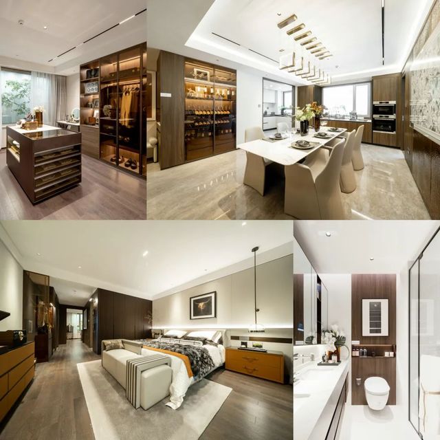 此次公開(kāi)的樣板間為265㎡奢華四房?jī)蓮d三衛(wèi)雙陽(yáng)臺(tái)戶(hù)型,在戶(hù)型研發(fā)和飾面材料使用上,設(shè)計(jì)團(tuán)隊(duì)都針對(duì)主要客戶(hù)人群的需求,經(jīng)過(guò)反復(fù)斟酌,對(duì)細(xì)節(jié)處理更是精益求精,成為奧體公司迭新之作。硬朗的石材紋理與沉穩(wěn)的木飾面碰撞出豐富的層次變化,加上墻面局部銅制捶打紋飾面和內(nèi)嵌式金屬開(kāi)關(guān)面板,營(yíng)造低調(diào)奢華的現(xiàn)代風(fēng)格。