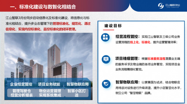 會上,設計成本部匯報了集團各公司標準化工作整體推進情況,奧體公司、新城公司、園林公司、青奧城公司、江山智聯(lián)物業(yè)公司、濱江公園公司分別展示了最新的標準化工作成果。各公司標準化的工作緊緊圍繞其主營業(yè)務展開,貼合自身需求,特色鮮明。