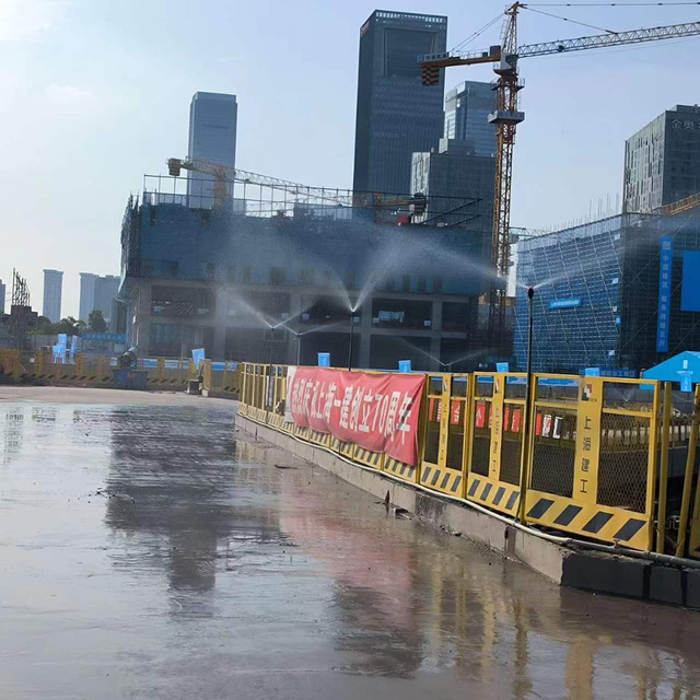 該項(xiàng)目A、B、C區(qū)目前處于底板施工階段,針對(duì)揚(yáng)塵管控,新城公司項(xiàng)目管理團(tuán)隊(duì)嚴(yán)格按照“十達(dá)標(biāo)”管理標(biāo)準(zhǔn)進(jìn)行施工,在出入口規(guī)范設(shè)置沖洗平臺(tái),并配合高壓水槍等設(shè)備對(duì)進(jìn)出車(chē)輛進(jìn)行全方位沖洗,杜絕了車(chē)輛帶泥上路。施工現(xiàn)場(chǎng)配備霧炮機(jī)、高桿噴淋進(jìn)行360°旋轉(zhuǎn)降塵。同時(shí),項(xiàng)目安排專(zhuān)人對(duì)施工道路進(jìn)行清掃,灑水車(chē)不間斷灑水使道路保持濕潤(rùn),進(jìn)一步提升工地抑塵效果。