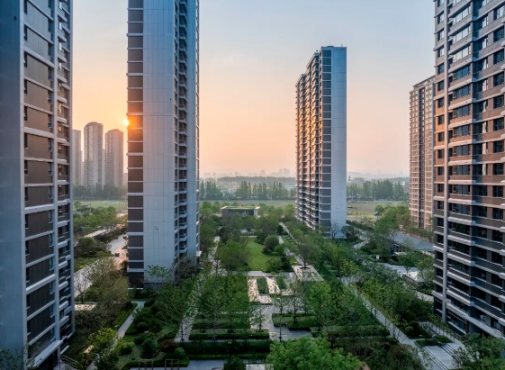 小區(qū)以1300平方米的陽光草坪為核心,烏桕林、櫻花林與低矮灌木穿插其間,形成“花葉共賞、四季生機”的浪漫花廊;烏桕林與水景水系則構成“水榭林間”中央景觀軸,融入生態(tài)草坪設計,增強了居民與自然的互動體驗。